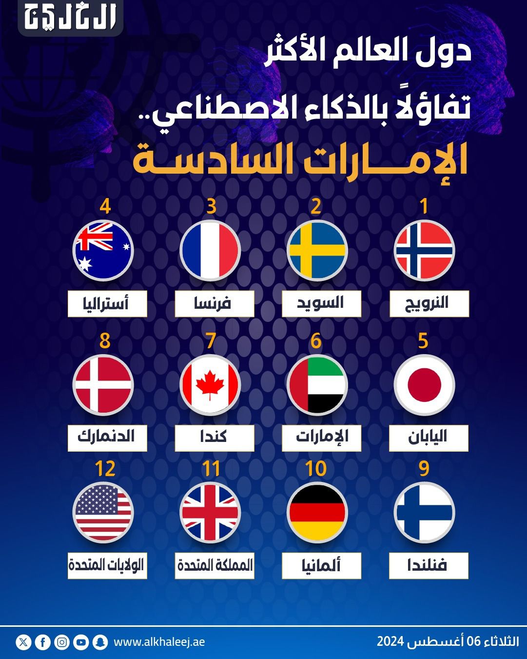 وجاء ترتيب الدول الأكثر تفاؤلاً بالذكاء الاصطناعي كالتالي: النرويج والسويد وفرنسا وأستراليا واليابان والإمارات وكندا والدنمارك وفنلندا وألمانيا والمملكة المتحدة والولايات المتحدة الأمريكية.