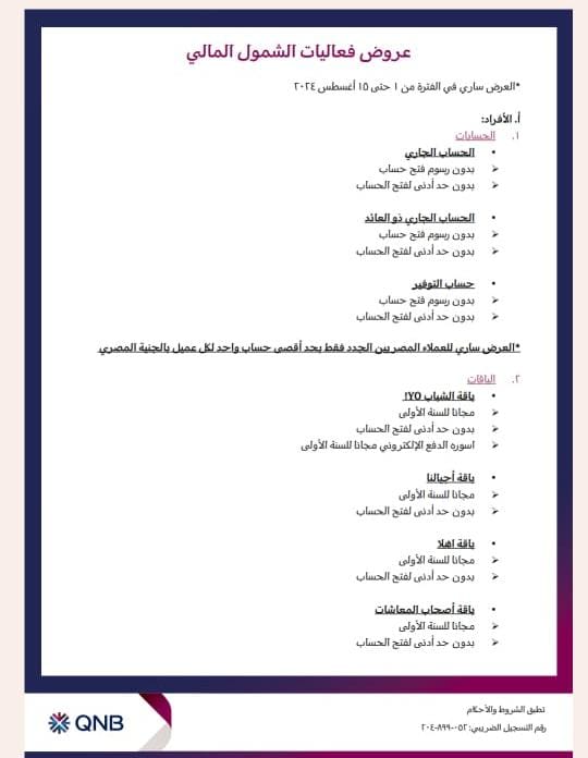 أعلن بنك QNB عن إتاحة فتح حساب(جاري-جاري ذو العائد-توفير) مجانا وبدون أي مصاريف بدون حد أدنى ، بالإضافة إلى الاشتراك في مجموعة متنوعة من الباقات خلال الفترة من 1 إلى 15 أغسطس الجاري.