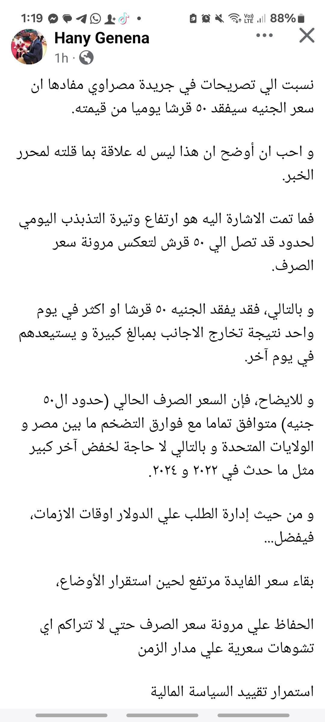 وقال إن السعر الصرف الحالي (حدود ال 50 جنيها) متوافق تماما مع فوارق التضخم ما بين مصر و الولايات المتحدة و بالتالي لا حاجة لخفض آخر كبير مثل ما حدث في 2022 و 2024.