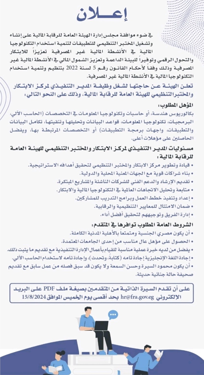 أعلنت الهيئة العامة للرقابة المالية عن حاجتها لشغل وظيفة المدير التنفيذي لمركز الابتكار والمختبر التنظيمي (الكوربيه) التابع لها والذي استعادته من البورصة مؤخرا.