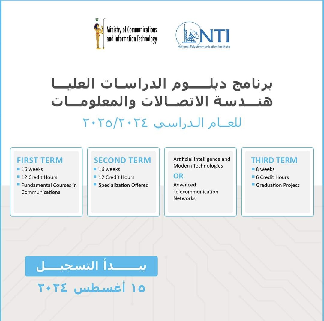 يُطلق المعهد القومي للاتصالات دورة جديدة من برنامج دبلوم الدراسات العليا في هندسة الاتصالات والمعلومات للعام الدراسي 2024/2025، في خطوة لتعزيز التعليم المتخصص في مجالات تكنولوجيا المعلومات والاتصالات.