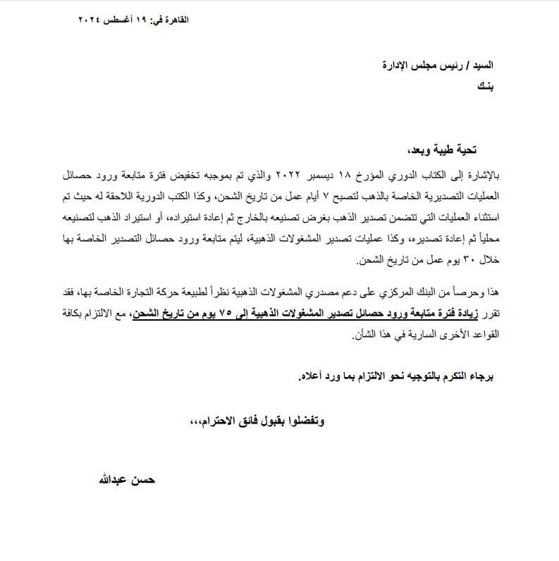 يعود هذا القرار إلى الكتاب الدوري الصادر في 18 ديسمبر 2022 والذي قام بتخفيض فترة متابعة ورود حصائل العمليات التصديرية الخاصة بالذهب إلى 7 أيام عمل.