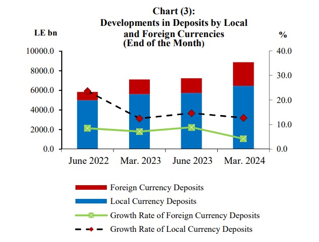 وبالمثل، ارتفعت الودائع بالعملة المحلية بنسبة 12.8%. وبالتالي، شكلت نسبة الودائع بالعملات الأجنبية إلى إجمالي الودائع 27.3% في نهاية مارس 2024.