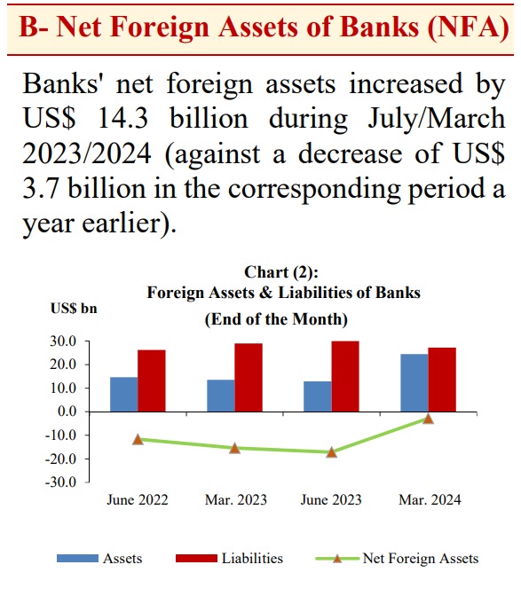 أعلن البنك المركزي المصري، عن ارتفاع صافي الأصول الأجنبية للبنوك المصرية بنحو 14.3 مليار دولار خلال الفترة من يوليو 2023 إلى مارس 2024، مقارنة بانخفاض قدره 3.7 مليار دولار في الفترة المقابلة من العام السابق.