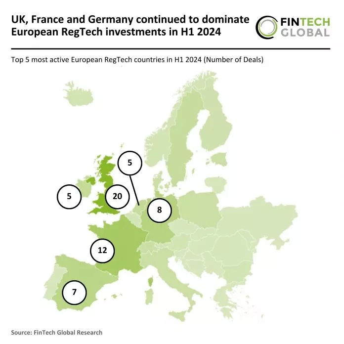 رغم انخفاض عدد الصفقات، حافظت المملكة المتحدة وفرنسا وألمانيا على مراكزها الثلاثة الأولى كأكثر الأسواق نشاطاً في مجال RegTech في أوروبا، استناداً إلى عدد الصفقات المبرمة.
