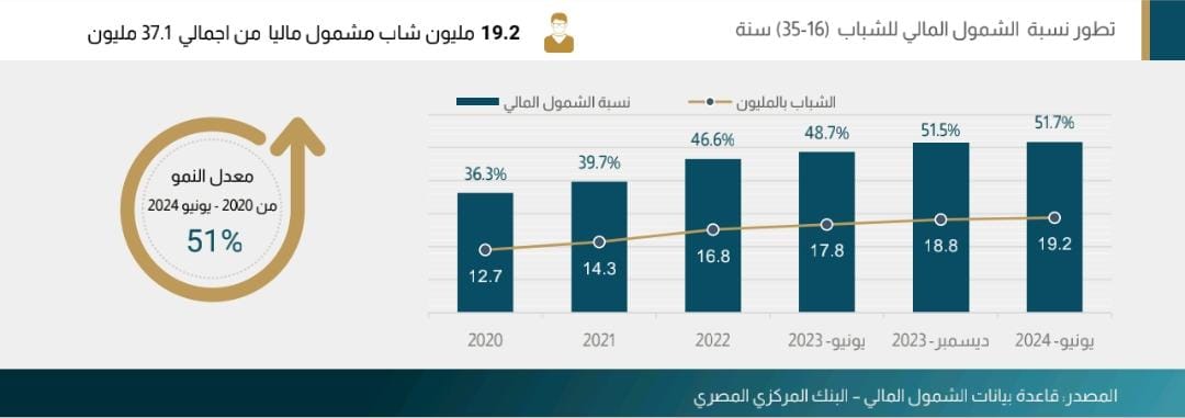 ويشير هذا الارتفاع إلى أن ما يقرب من 19.2 مليون شاب مصري لديهم الآن حسابات مصرفية، مما يعكس نجاح الجهود المبذولة لتعزيز الشمول المالي لهذه الفئة العمرية الهامة.