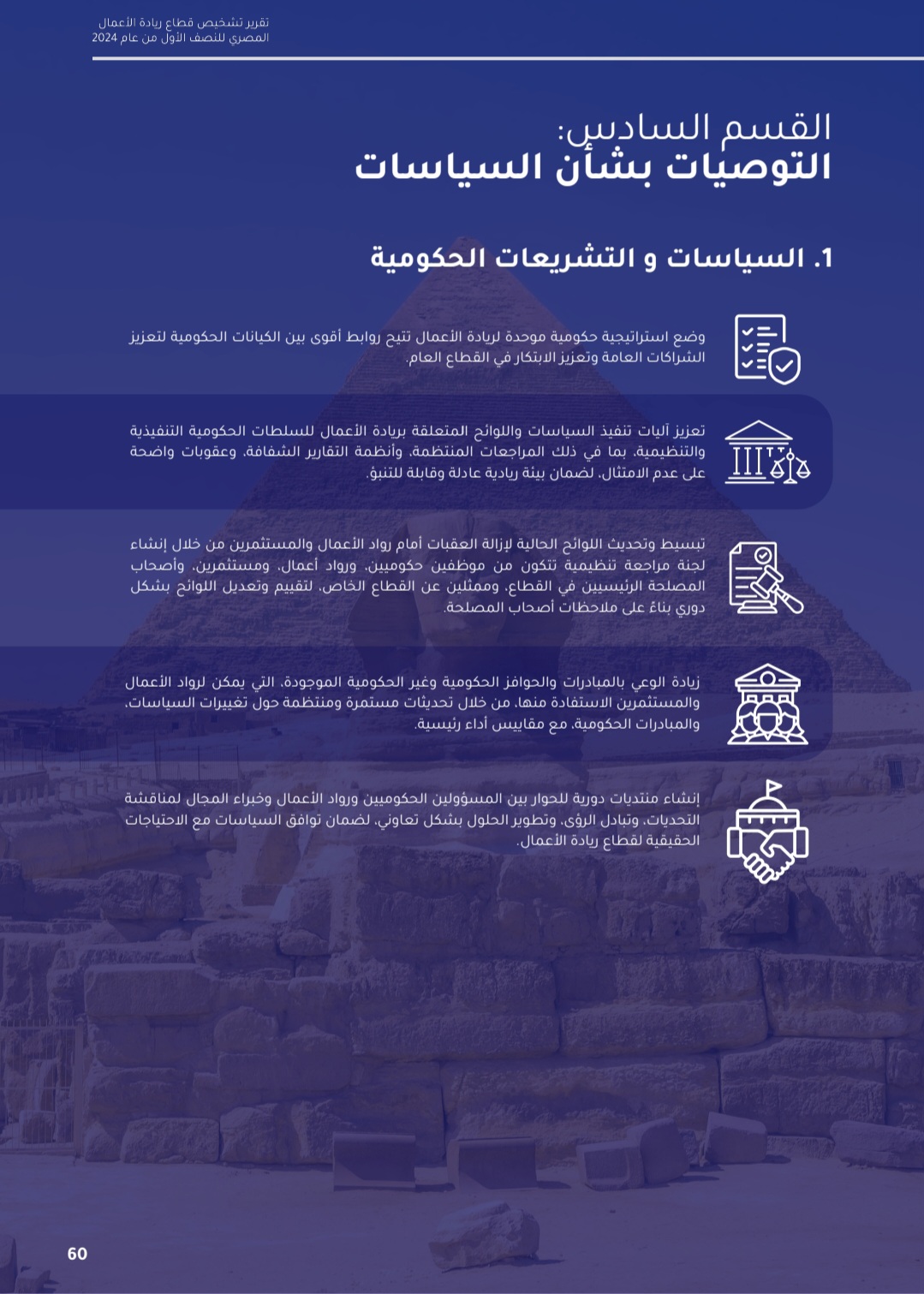 وطالبت أيضا بإنشاء منتديات دورية للحوار بين المسؤولين الحكوميين ورواد الأعمال وخبراء المجال لمناقشة التحديات، وتبادل الرؤى وتطوير الحلول بشكل تعاوني لضمان توافق السياسات مع الاحتياجات الحقيقية لقطاع ريادة الأعمال.