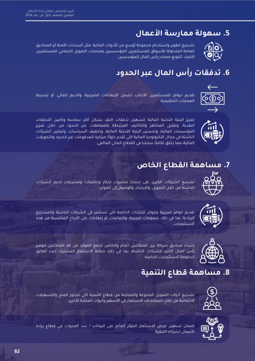 وأكدت على أهمية زيادة الوعي بالمبادرات والحوافر الحكومية وغير الحكومية الموجودة التي يمكن لرواد الأعمال والمستثمرين الاستفادة منها، من خلال تحديثات مستمرة ومنتظمة حول تغييرات السياسات. والمبادرات الحكومية مع مقاييس أداء رئيسية.