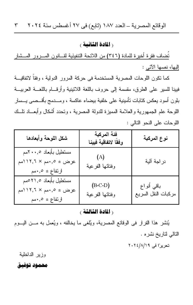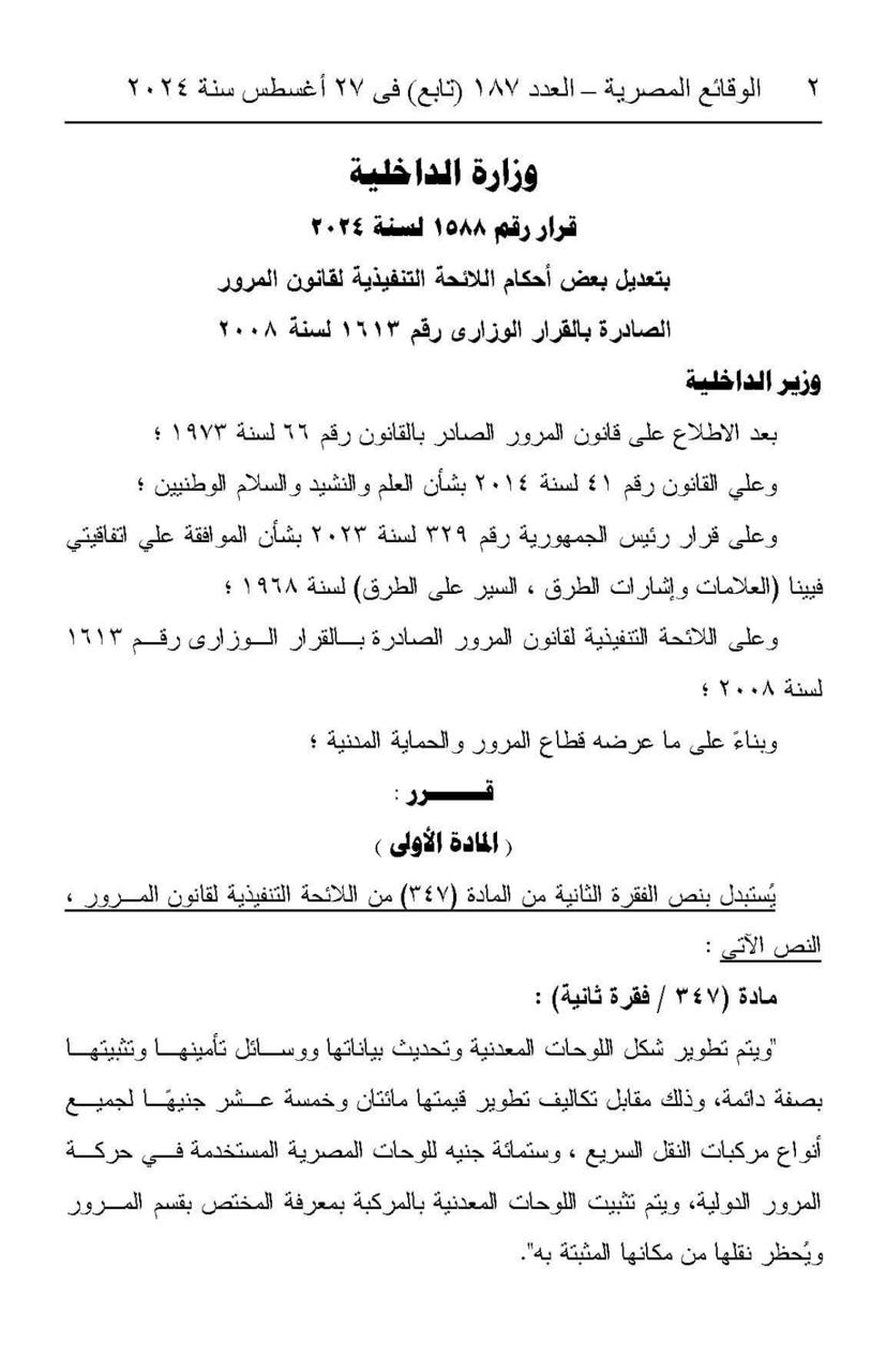 نشرت الجريدة الرسمية قرارا لوزير الداخلية رقم 1588 لسنة 2024، بشأن تعديل بعض أحكام اللائحة التنفيذية لقانون المرور الصادرة بالقرار الوزاري رقم 1613 لسنة 2008، مُتضمنا استبدال نص الفقرة الثانية من المادة 347 من اللائحة التنفيذية لقانون المرور.