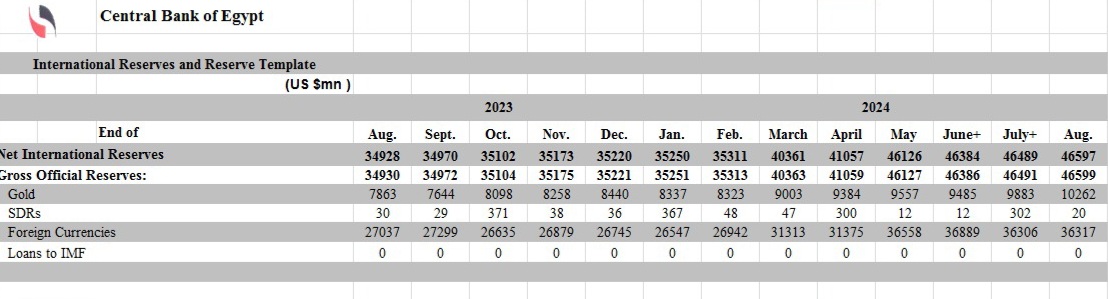 وارتفع احتياطي النقد الأجنبي لمصر إلى 46.597 مليار دولار بنهاية أغسطس مقابل 46.489 مليار دولار بنهاية يوليو الماضى 2024 .