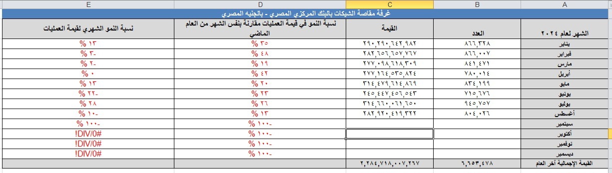 كشف البنك المركزي المصري في تقرير صادر عنه عن تسوية 6.653 مليون عملية عبر غرفة مقاصة الشيكات بالجنيه المصري بقيمة 2.285 تريليون جنيه خلال الـ8 أشهر الأولى من عام 2024.