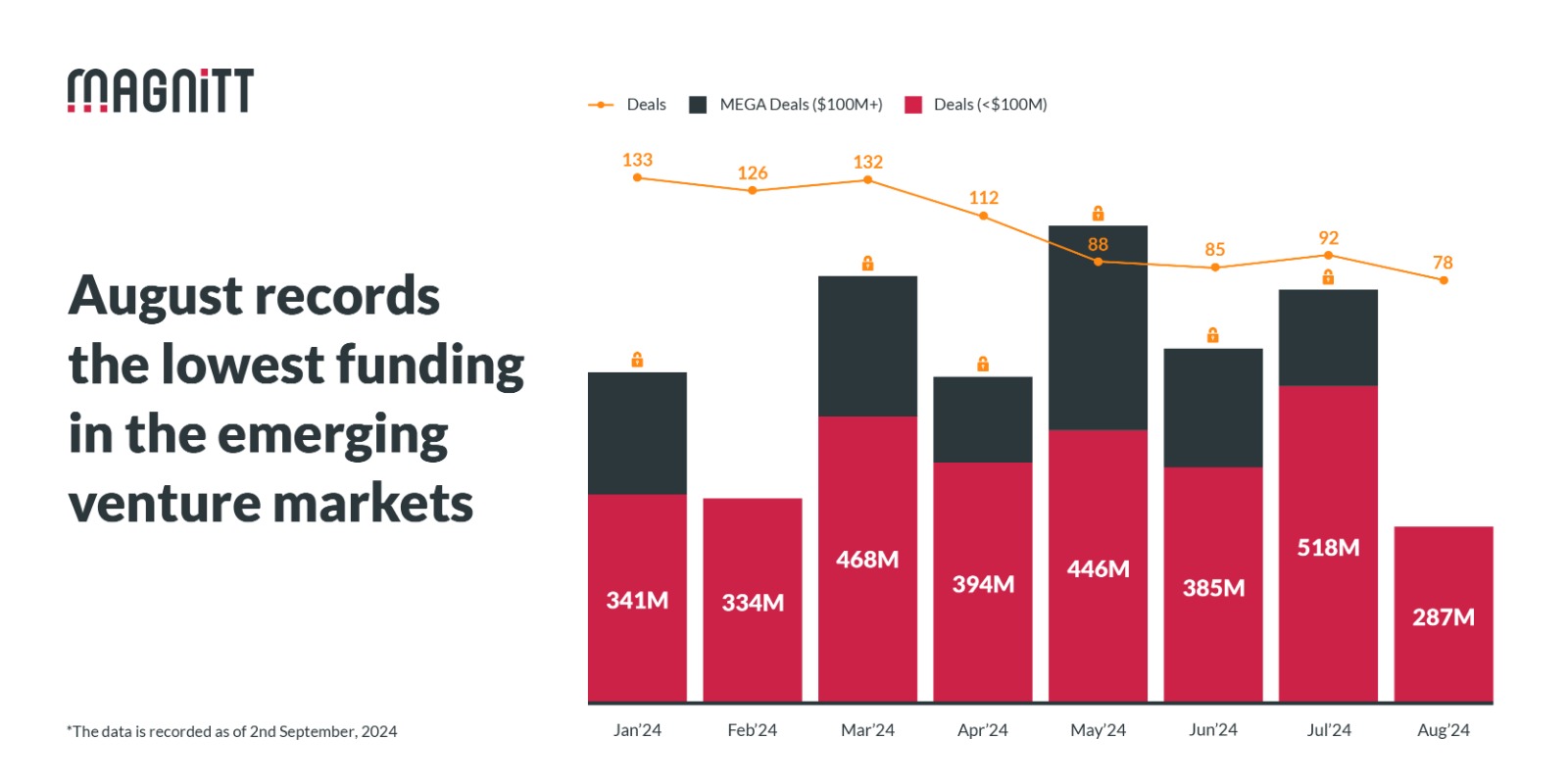 وقال التقرير إن شهر أغسطس 2024 أثبت أنه شهر صعب لتمويل رأس المال المغامر، حيث سجل أدنى المبالغ المسجلة هذا العام، فوفقًا لشركة MAGNiTT – شهد أغسطس جمع 287 مليون دولار فقط عبر 78 صفقة بما في ذلك الشرق الأوسط وأفريقيا وجنوب شرق آسيا وتركيا وباكستان.