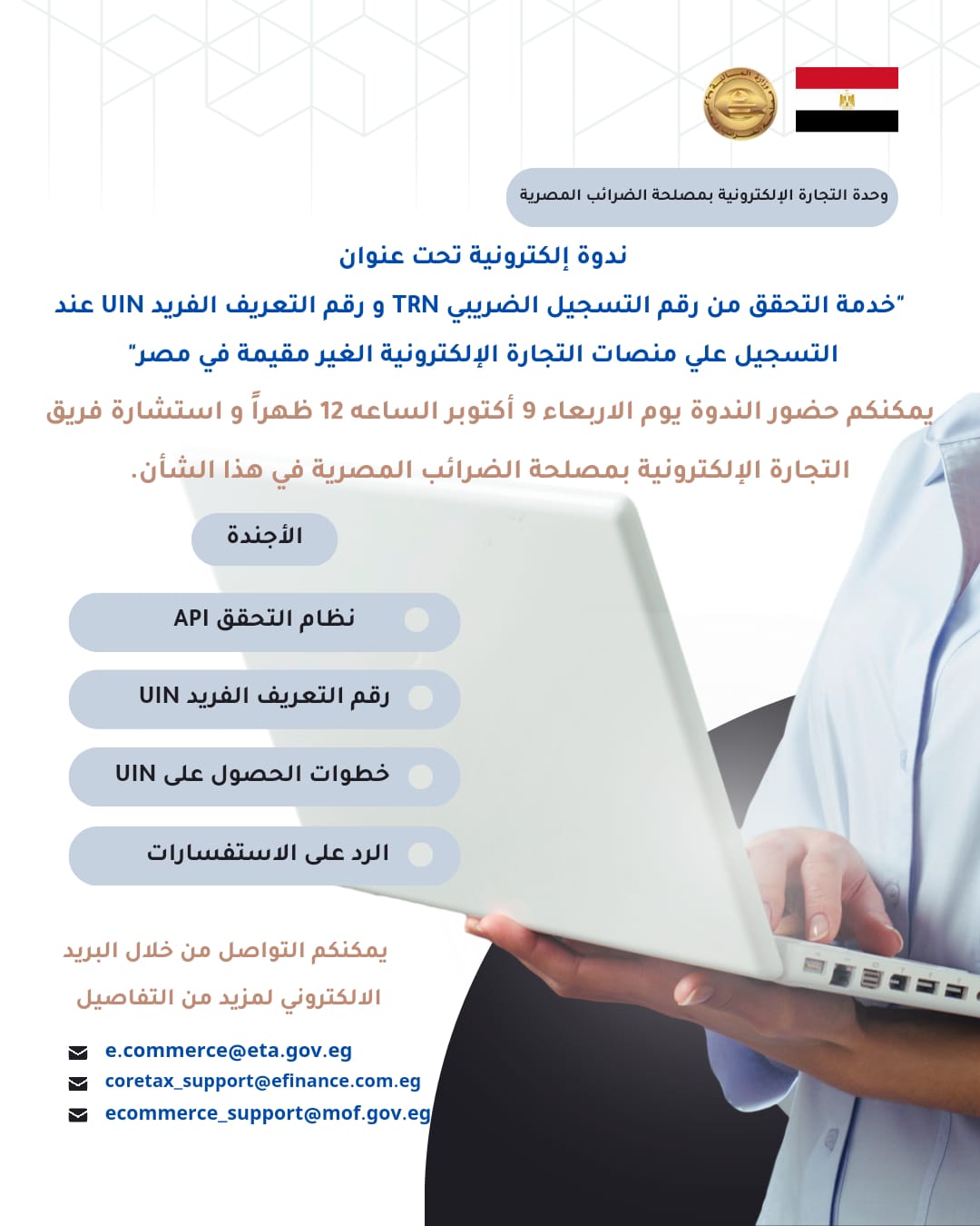 أعلنت وحدة التجارة الإلكترونية بمصلحة الضرائب المصرية عن تنظيم ندوة أونلاين تحت عنوان: “خدمة التحقق من رقم التسجيل الضريبي TRN ورقم التعريف الفريد UIN عند التسجيل على منصات التجارة الإلكترونية الغير مقيمة في مصر.”