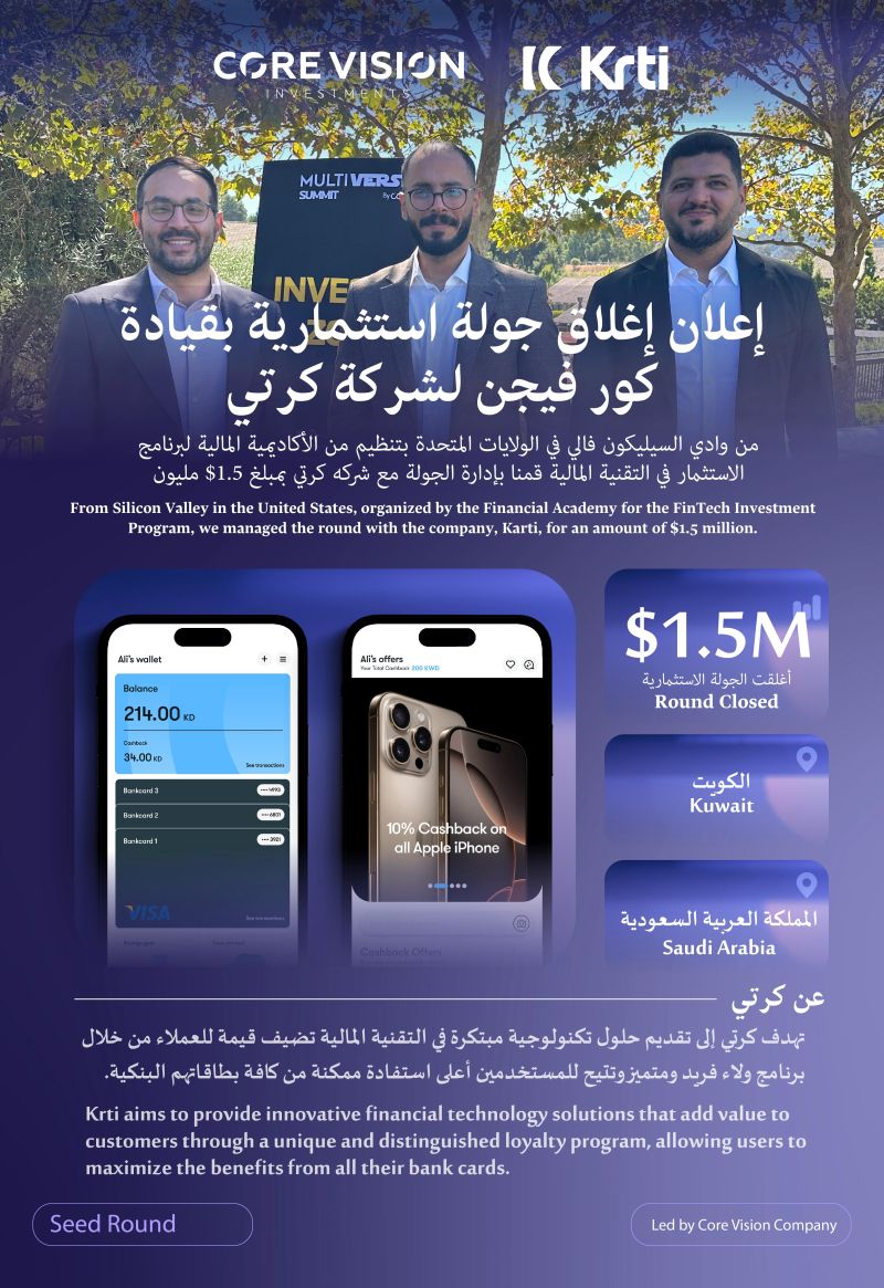 قادت شركة «كور فيجن إنفستمنت Core Vision Investment» جولة استثمارية Pre seed بقيمة 1.5 مليون دولار لصالح شركة «krti» القابضه في «وادي السيليكون Silicon Valley» بمدينة سان فرانسيسكو الأمريكية، في إطار برنامج الاستثمار في التقنية المالية بتنظيم من «The Financial Academy | الأكاديمية المالية».
