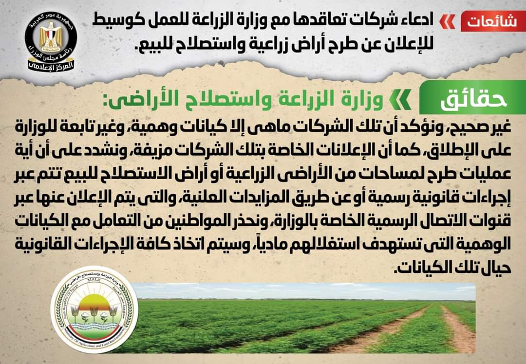 نفى المركز الإعلامي لمجلس الوزراء ما تداولته بعض صفحات التواصل الاجتماعي أنباء بشأن ادعاء شركات تعاقدها مع وزارة الزراعة للعمل كوسيط للإعلان عن طرح أراض زراعية واستصلاح للبيع.
