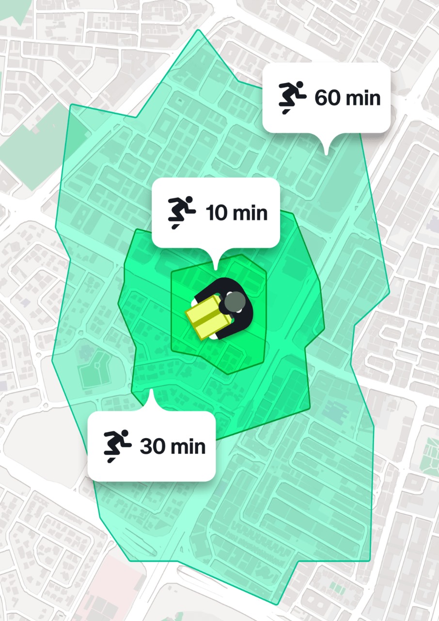 تحدد واجهة برمجة التطبيقات “Isochrone”المناطق التي يمكن الوصول إليها من موقع محدد – مثل مستودع ما أو نقطة بيع – في إطار زمني محدد، وتأخذ في الاعتبار مجموعة من العوامل، مثل ظروف الطريق وحركة المرور وتوقعات الطقس عبر وسائل النقل المختلفة، بما في ذلك السيارات، وسائل النقل العام، الدراجات الهوائية، الدراجات البخارية أو السكوتر، وحتى المشي، لتوفير أدقّ النتائج. يتميز هذا الحل الرائد بقابليته للتكيف، مما يجعله الحل المثالي لتخطيط المسار بصورة استباقية وفي الوقت الفعلي.