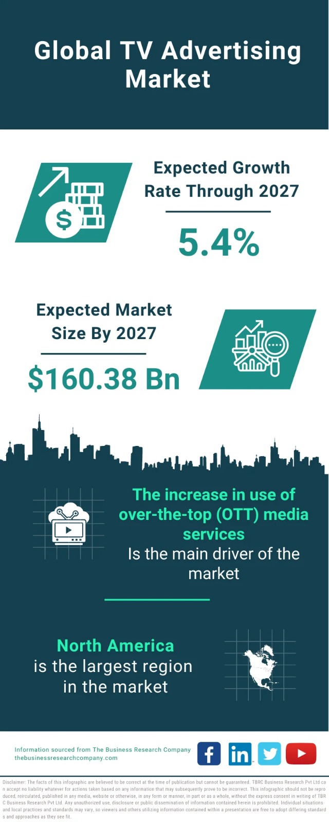توقع تقرير صادر عن شركة The Business Research Company للأبحاث،أن ينمو سوق الإعلانات التلفزيونية من 129.61 مليار دولار في عام 2023 إلى 137.9 مليار دولار في عام 2024، بمعدل نمو سنوي مركب يبلغ 6.4%.