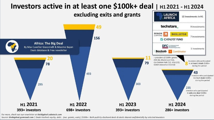 ووفقًا لتقرير النصف الأول من 2024 الذى أصدرته Africa: The Big Deal فإن ما يقارب من 300 مستثمر شاركوا في صفقة بقيمة تتجاوز 100 ألف دولار على الأقل، وهو أقل بنسبة 27% عن النصف الأول من 2023 (حوالي 400 مستثمر) وأقل بمرتين ونصف من نفس الفترة في عام 2022 (حوالي 700).