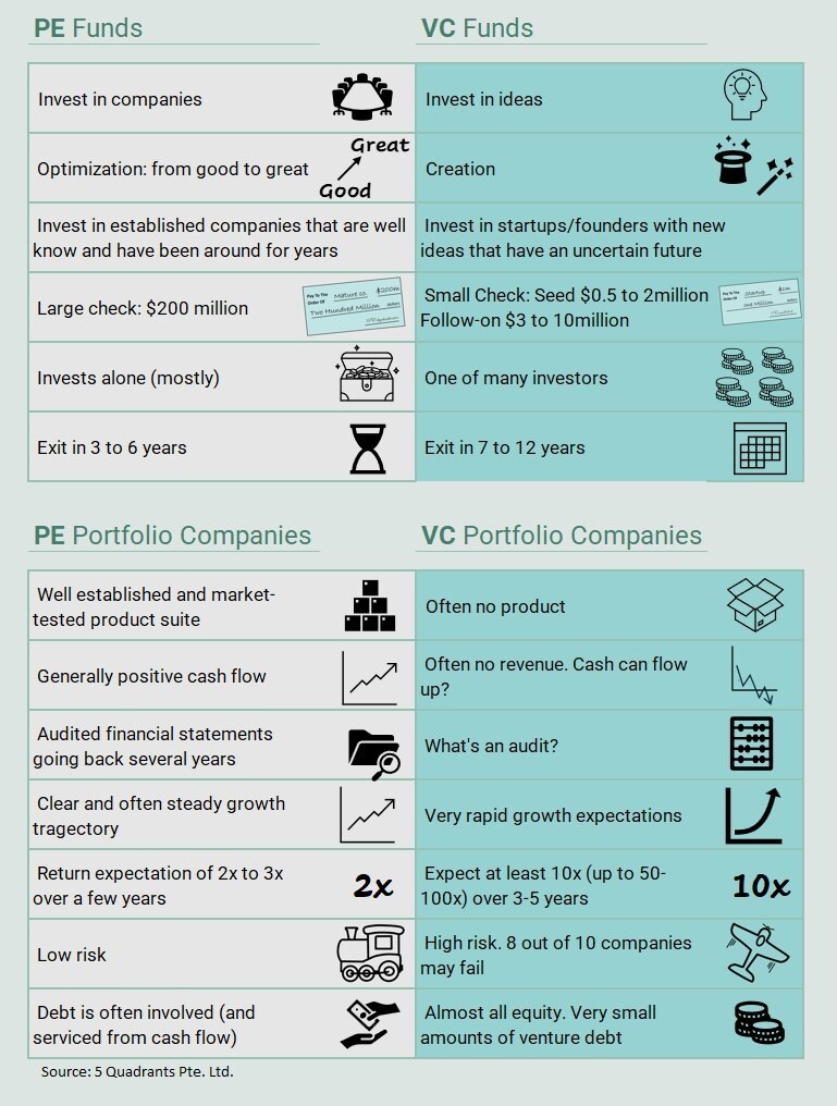 في بداية التقرير، أكد كل من زايسبيرجر ومونرو أن هناك اختلافًا في أنواع رأس المال الخاص: فبينما يعمل الاستثمار المباشر على تحسين الشركة، يقوم رأس المال الاستثماري بإنشاء شركة. ويأتي هذا التمييز مع اختلاف مستويات المخاطر، وآفاق الاستثمار، والعوائد المتوقعة، والأهم من ذلك اختلاف طرق التقييم.