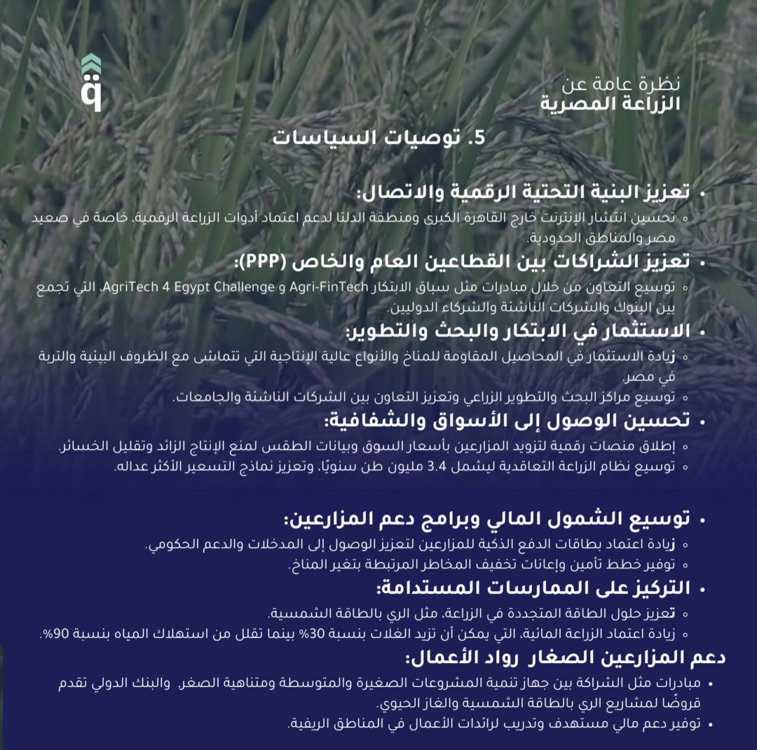 وأوصى التقرير بضرورة الاستثمار في الابتكار والبحث والتطوير زيادة الاستثمار في المحاصيل المقاومة للمناح والأنواع عالية الإنتاجية التي تتماشى مع الظروف البيئية والتربة في مصر وتوسيع مراكز البحث والتطوير الزراعي وتعزيز التعاون بين الشركات الناشئة والجامعات.