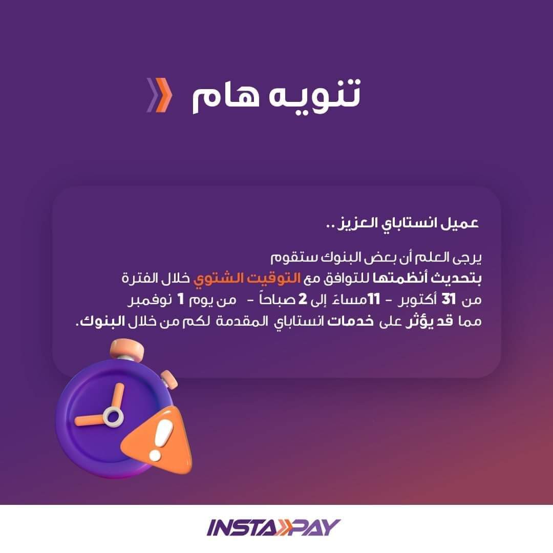 أعلن تطبيق شبكة المدفوعات اللحظية إنستاباي أن بعض البنوك ستقوم بتحديث أنظمتها للتوافق مع التوقيت الستوي الخميس المقبل من الساعة 11 مساء وحتى 2 صباحا.
