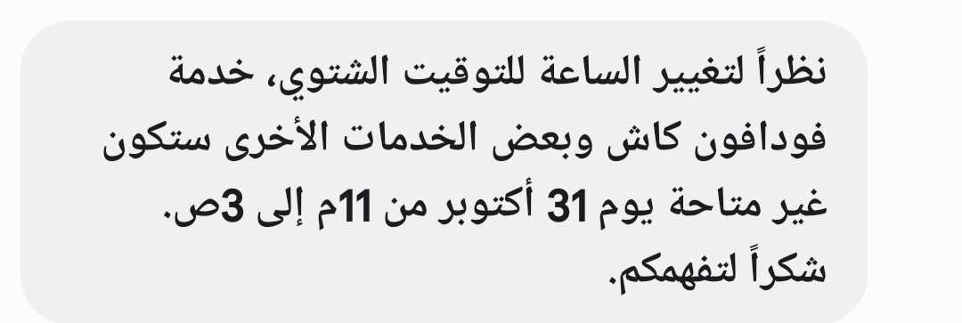 أرسلت شركة فودافون رسالة إلى عملائها تفيد بتوقف خدمة فودافون كاش وبعض الخدمات الأخرى اليوم الخميس نظرا لتغيير الساعة للتوقيت الشتوي.