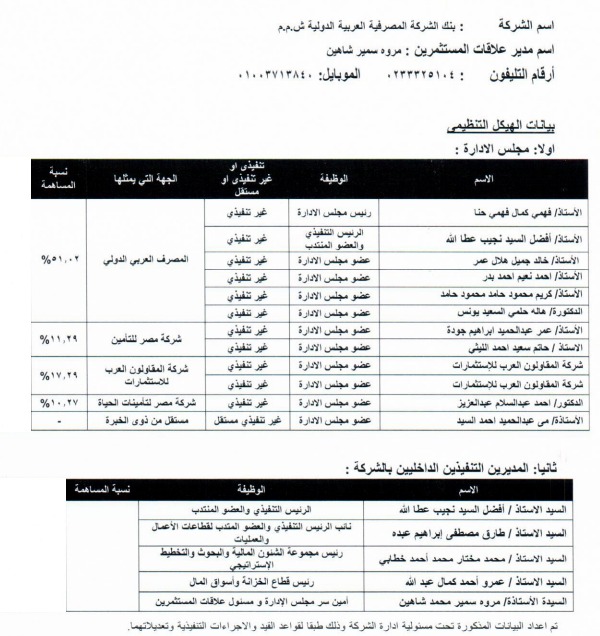 ويضم التشكيل الجديد لمجلس الإدارة أربعة أعضاء غير تنفيذيين يمثلون المصرف العربي الدولي، منهم خالد جميل هلال وأحمد نعيم بدر، إلى جانب أعضاء آخرين يمثلون جهات بارزة مثل شركة مصر للتأمين والمقاولون العرب للاستثمارات، فضلاً عن مي عبد الحميد التي تنضم كعضو مستقل من ذوي الخبرة.