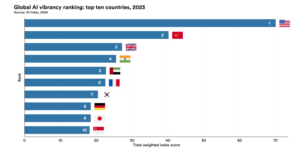 أصدر مؤشر الذكاء الاصطناعي التابع لمعهد Stanford Institute for Human-Centered AI (HAI)، أداة قياس حيوية الذكاء الاصطناعي العالمية التي تسمح بإجراء مقارنات مرنة بين 36 دولة بناءً على 42 مؤشرًا متاحًا للذكاء الاصطناعي.