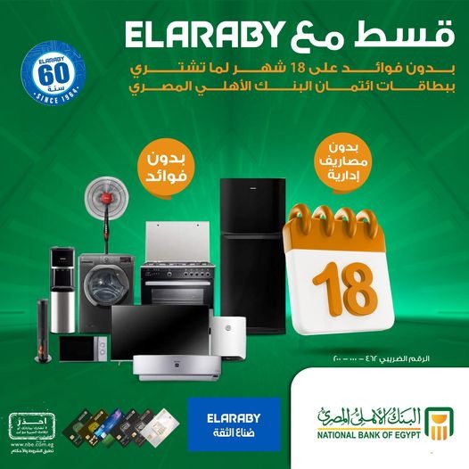 أعلن البنك الأهلي المصري عن تقديم عرض مميز لحاملي بطاقاته الائتمانية، يتيح لهم تقسيط قيمة الأجهزة المنزلية من مجموعة العربي على مدار 18 شهرًا بدون مقدم أو فوائد أو مصاريف إدارية.