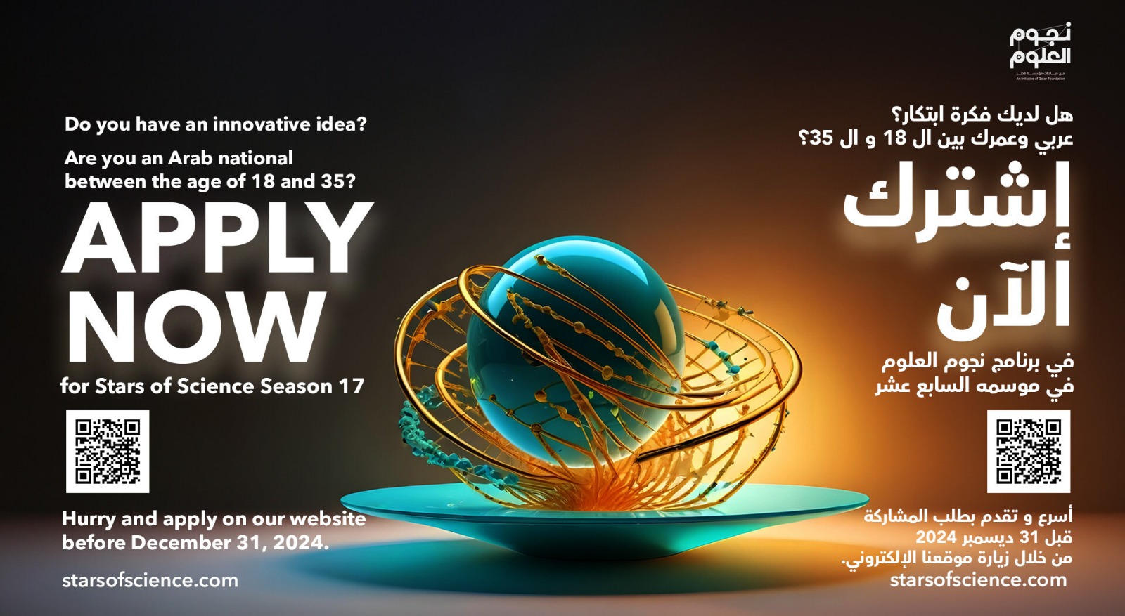 استكمالاً لمسيرته في تعزيز الابتكار العلمي، يستمر”نجوم العلوم”، البرنامج التعليمي والترفيهي الرائد، التابع لمؤسسة قطر، في تلقي طلبات التقدم للمشاركة في موسمه السابع عشر، مناشدًا المبتكرين العرب الطموحين من كافة أنحاء العالم بالمسارعة في تقديم طلب الالتحاق وذلك قبل 31 ديسمبر 2024.