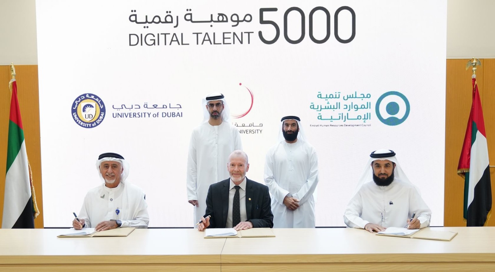 وفي إطار مبادرة “5000 موهبة رقمية”، وقع مكتب الذكاء الاصطناعي والاقتصاد الرقمي وتطبيقات العمل عن بُعد، مذكرة تفاهم مع مجلس تنمية الموارد البشرية الإماراتية، بهدف تعزيز التعاون مع الشركات التقنية الكبرى وتطوير الكفاءات وتدريب 5000 طالب خلال خمس سنوات لتأهيل الكوادر الوطنية وإعدادهم للمناصب التكنولوجية في كبريات الشركات العالمية.