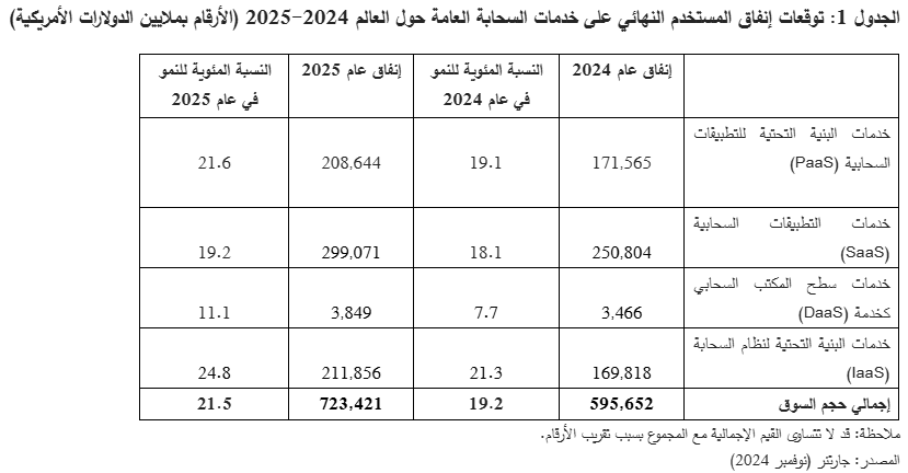 أظهرت أحدث توقعات شركة جارتنر للأبحاث أن الإنفاق العالمي للمستخدم النهائي على السحابة العامة سيصل إلى 723.4 مليار دولار أمريكي في عام 2025، في زيادة عن الرقم السابق البالغ 595.7 مليار دولار أمريكي في عام 2024.