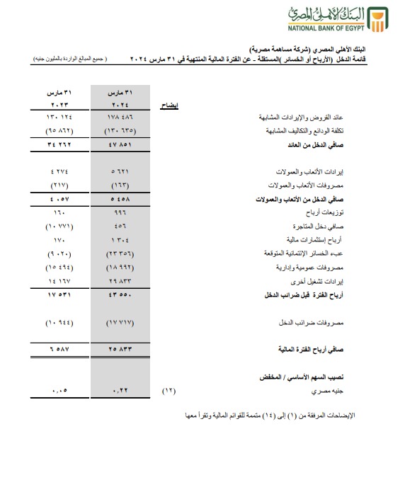 وشهد صافي الدخل من العائد زيادة بنسبة 39.6% ليصل إلى 47.851 مليار جنيه بنهاية مارس 2024، مقارنة بـ 34.262 مليار جنيه خلال نفس الفترة من العام السابق.
