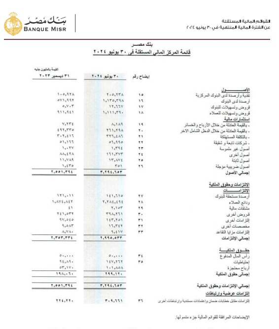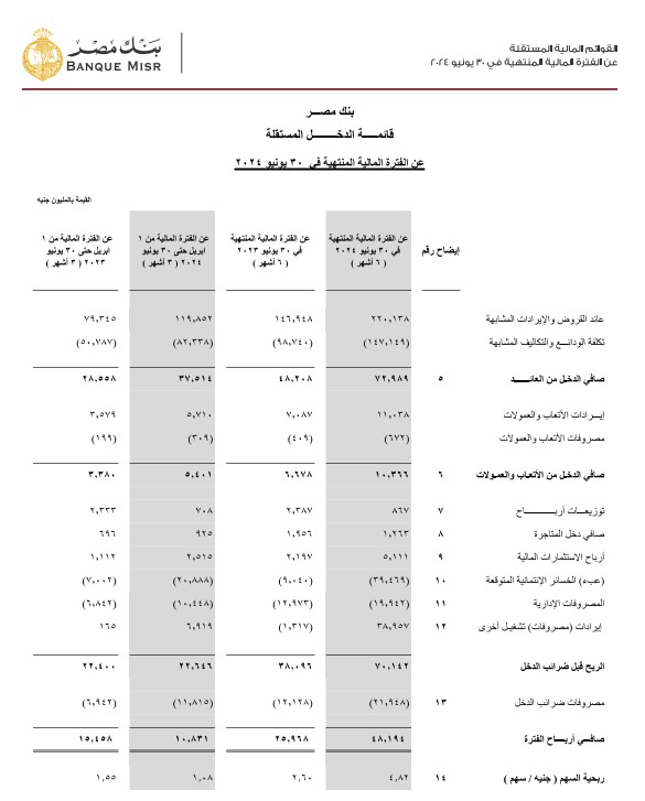 أعلن بنك مصر عن تحقيق أداء مالي متميز خلال النصف الأول من عام 2024.