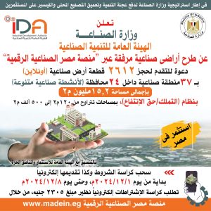 وتتم كافة إجراءات الحجز وسحب كراسات الشروط وتقديم المستندات المطلوبة إلكترونيًا في الفترة من 1-8 ديسمبر عن طريق الموقع الإلكتروني لمنصة مصر الصناعية الرقمية (www.madein.eg) للدخول على الخريطة وذلك بالتنسيق الكامل مع الهيئة العامة للاستثمار.