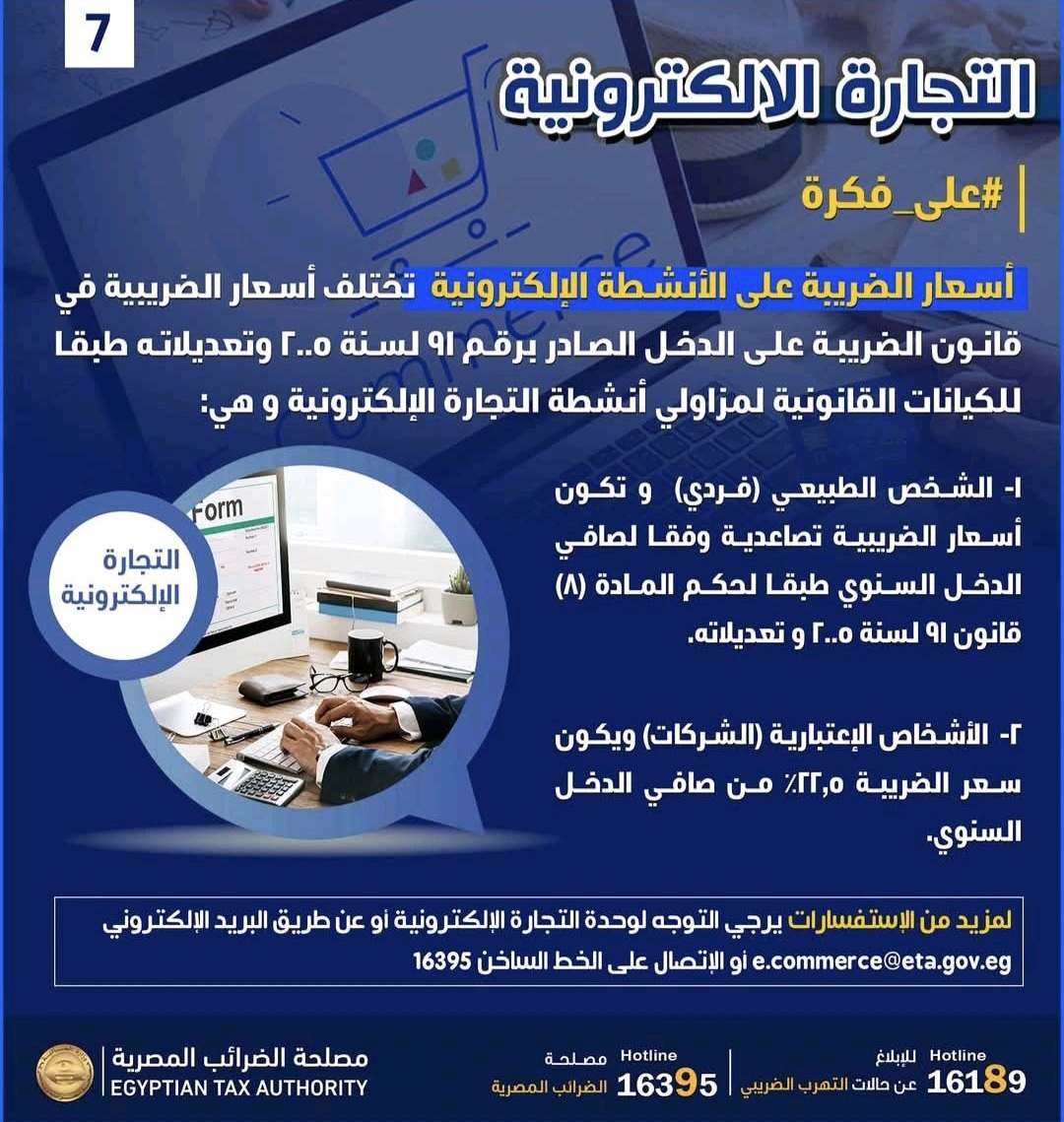 وطالبت بضرورة التوجه لوحدة التجارة الإلكترونية بمصلحة الضرائب في حال وجود أي استفسارات أو الإتصال بالرقم 16395 أو الإتصال على الخط الساخن 16189 في حال البلاغات أو عبر البريد الإلكتروني.