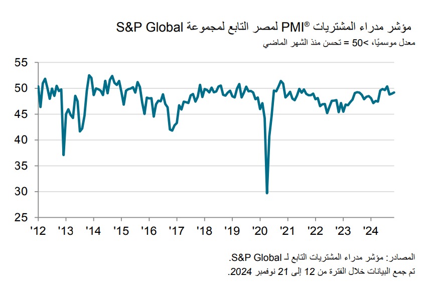 ارتفع مؤشر مدراء المشتريات (PMI) التابع لـ S&P Global المعدل موسميًا، وهو المقياس الذي يعكس أداء الطلبات الجديدة والإنتاج والتوظيف وتسليم الموردين ومخزون المشتريات، للشهر الثاني على التوالي في نوفمبر، مسجلًا 49.2 نقطة مقارنة بـ 49.0 نقطة في أكتوبر.