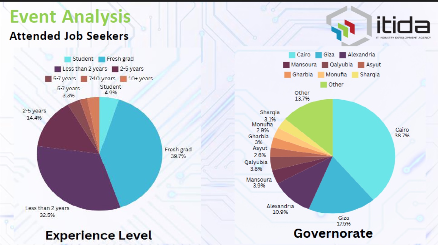 واجتذب الملتقى هذا العام باحثين عن فرص العمل من مختلف المحافظات، حيث جاءت القاهرة في المقدمة بنسبة 38.7% من إجمالي المتقدمين، تلتها الجيزة بنسبة 17.5%، ثم الإسكندرية بنسبة 10.9%. كما شهد الملتقى مشاركة ملحوظة من محافظات المنصورة (3.9%)، القليوبية (3.8%)، الشرقية (3.1%)، الغربية (3%)، المنوفية (2.9%)، وأسيوط (2.6%).