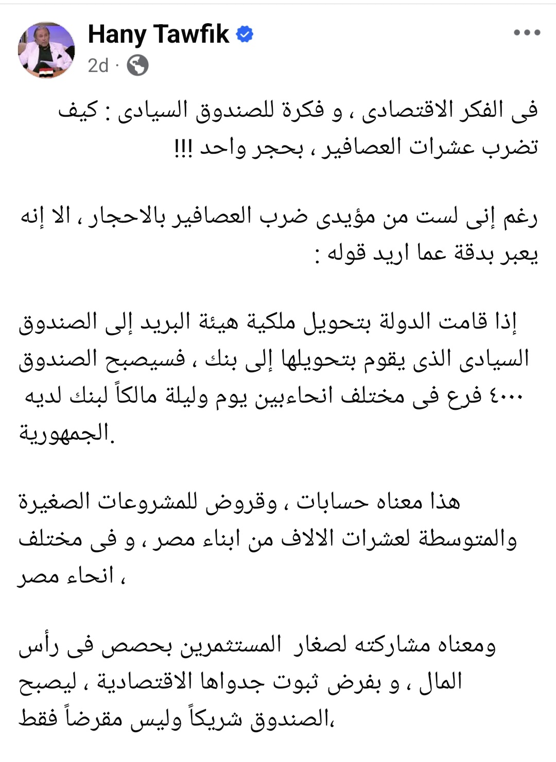 اقترح الخبير الاقتصادي هاني توفيق تحويل ملكية هيئة البريد المصرية إلى الصندوق السيادي ليصبح بنكا ضخما بآلاف الفروع في جميع أنحاء مصر.