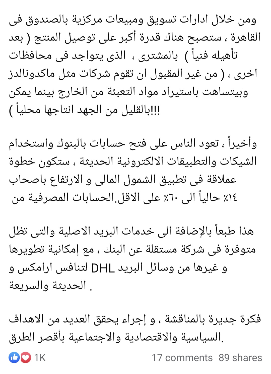 كما سيحفز التوطين الصناعي في مختلف المحافظات ويطور خدمات البريد لتنافس الشركات العالمية مثل أرامكس وDHL، ليضرب عصفورين بحجر: دعم الاقتصاد المحلي وتوسيع قاعدة المستفيدين من الخدمات المالية.