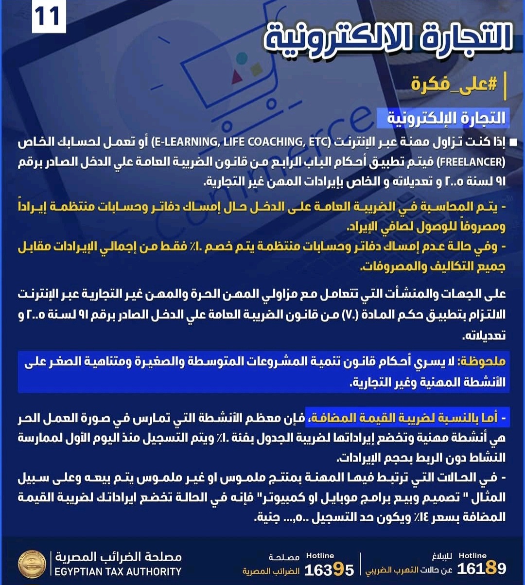 أوضحت وحدة التجارة الإلكترونية التابعة لمصلحة الضرائب المصرية أنه إذا كان الفرد يزاول مهنة عبر الانترنت(E-Learning, Life اوCoaching, etc) أو يعمل لحسابه الخاص (Freelancer) فيتم تطبيق أحكام الباب الرابع من قانون الضريبة العامة علي الدخل الصادر برقم 91 لسنة 2005 وتعديلاته والخاص بإيرادات المهن غير التجارية.