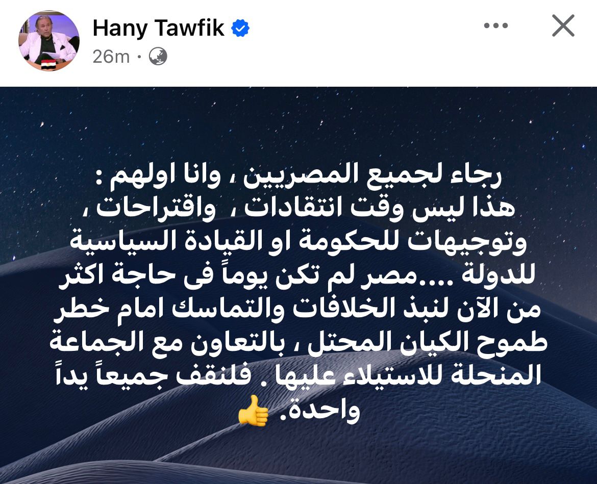 وقال توفيق: رجاء لجميع المصريين، وأنا اولهم.. هذا ليس وقت انتقادات، واقتراحات، وتوجيهات للحكومة او القيادة السياسية للدولة…. مصر لم تكن يوماً في حاجة اكثر من الآن لنبذ الخلافات والتماسك امام خطر طموح الكيان المحتل، بالتعاون مع الجماعة المنحلة للاستيلاء عليها. فلنقف جميعاً يداً واحدة”.