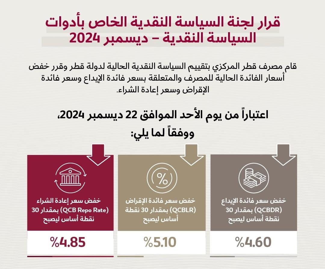 قرر مصرف قطر المركزي، اليوم الأربعاء خفض أسعار الفائدة للإيداع والإقراض وإعادة الشراء للمرة الثالثة على التوالي، بواقع 30 نقطة أساس.