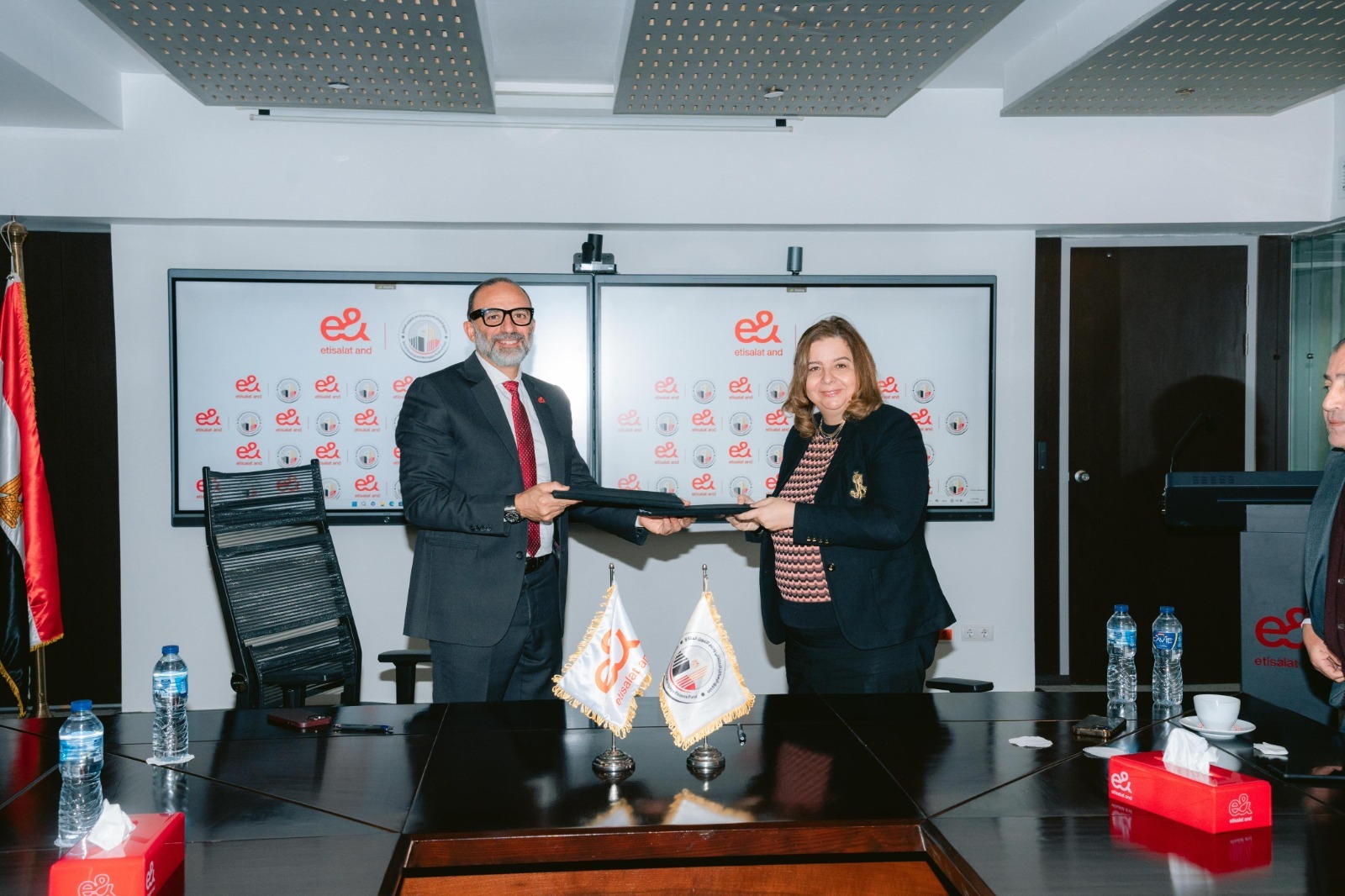 وقع البروتوكول المهندس حسام المعداوي الرئيس التنفيذي للقطاع المؤسسي بشركة إي آند مصر، والسيدة مي عبد الحميد الرئيس التنفيذي لصندوق الإسكان الاجتماعي ودعم التمويل العقاري.