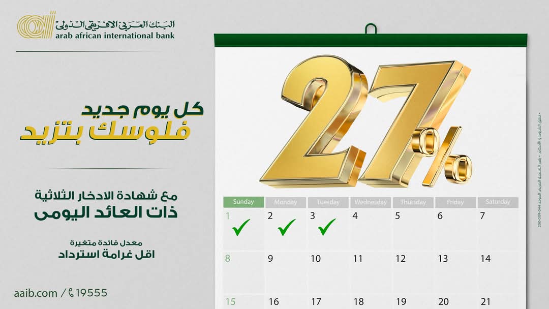 أعلن البنك العربي الأفريقي الدولي عن إطلاق “شهادة الإيداع اليومية”، التي تهدف إلى تلبية احتياجات العملاء الراغبين في الاستثمار والادخار وتحقيق أهدافهم المالية.