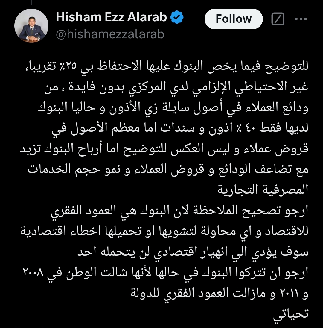 (للتوضيح فيما يخص البنوك عليها الاحتفاظ بي ٢٥٪ تقريبا، غير الاحتياطي الإلزامي لدي المركزي بدون فايدة ، من ودائع العملاء في أصول سايلة زي الأذون و حاليا البنوك لديها فقط ٤٠ ٪ اذون و سندات اما معظم الأصول في قروض عملاء و ليس العكس للتوضيح اما أرباح البنوك تزيد مع تضاعف الودائع و قروض العملاء و نمو حجم الخدمات المصرفية التجارية ارجو تصحيح الملاحظة لان البنوك هي العمود الفقري للاقتصاد و اي محاولة لتشويهها او تحميلها اخطاء اقتصادية سوف يؤدي الي انهيار اقتصادي لن يتحمله احد ارجو ان تتركوا البنوك في حالها لأنها شالت الوطن في ٢٠٠٨ و ٢٠١١ و مازالت العمود الفقري للدولة تحياتي).