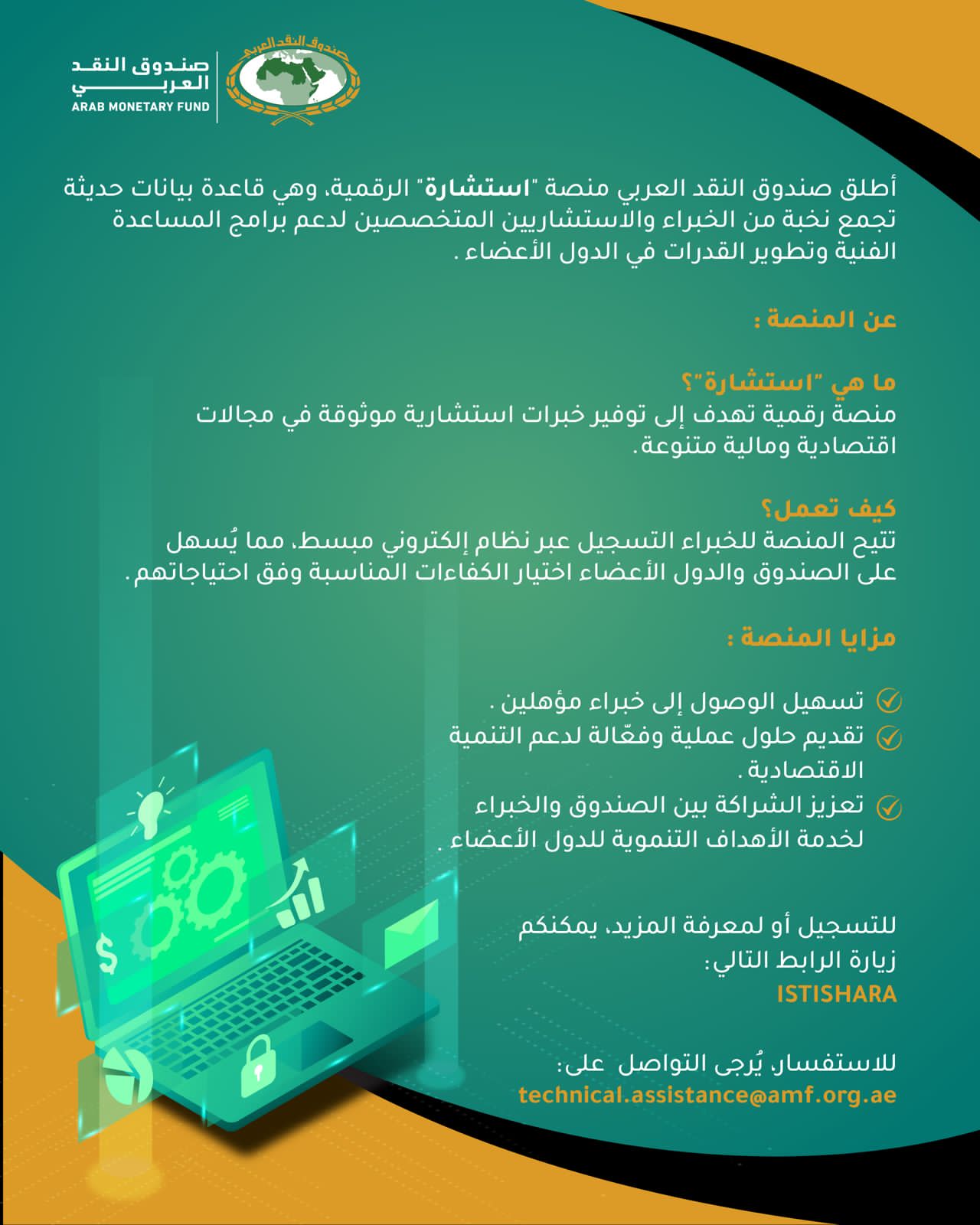 وأكد صندوق النقد العربي أن منصة “استشارة” تعكس التزامه بقيم التمكين والتطوير المستدام، من خلال إتاحة الفرصة للدول الأعضاء للوصول إلى أفضل الكفاءات العالمية، وتعزيز التعاون المشترك لتحقيق الأهداف الاقتصادية المرجوّة.