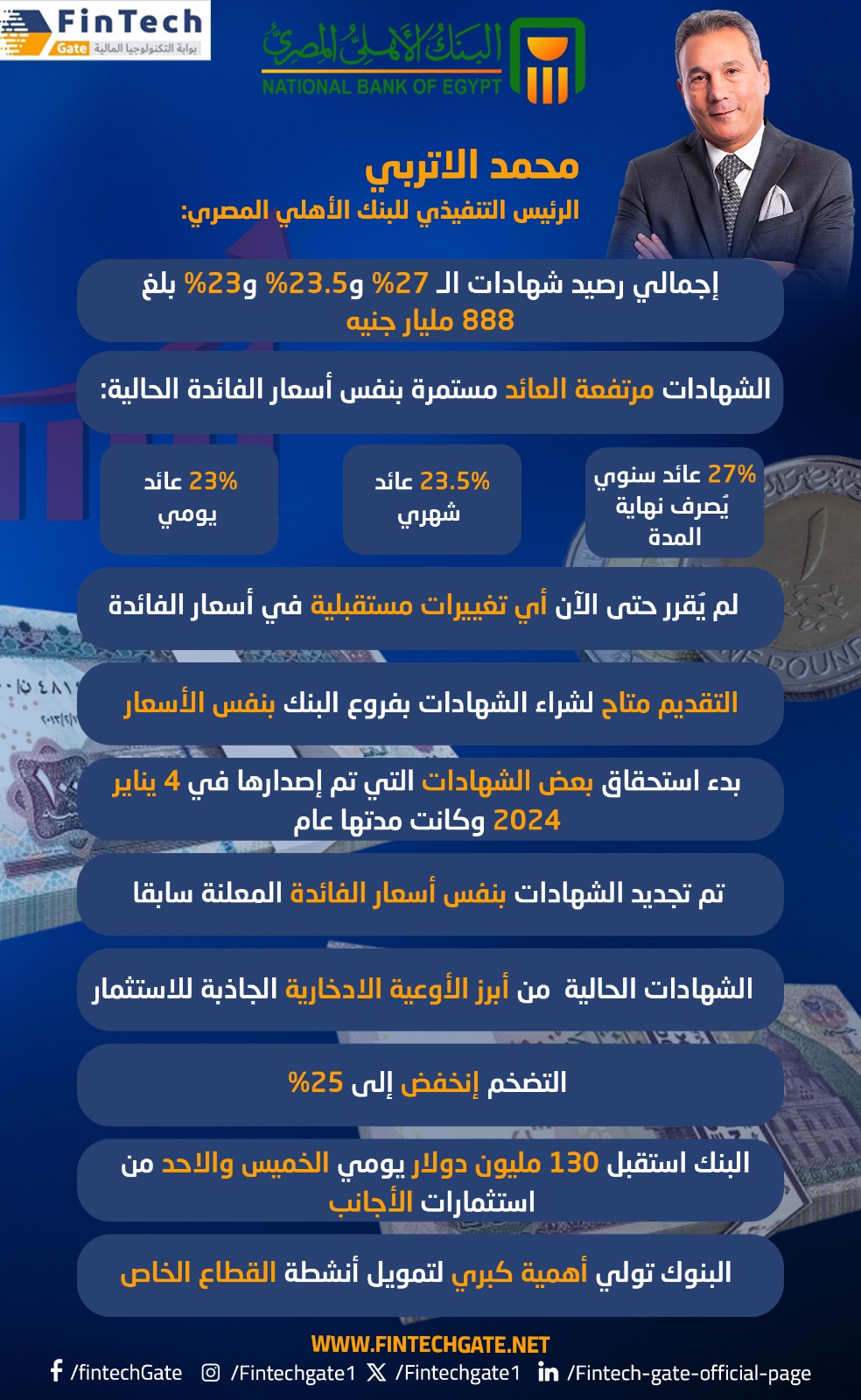 قال محمد الإتربي، الرئيس التنفيذي للبنك الأهلي المصري، إن حصيلة البنك الاهلي من الشهادات ذات الفائدة 27% و23.5% بلغت 888 مليار جنيه، مشيرا أن هذه الشهادات مستمرة بالسوق ولم تتوقف.