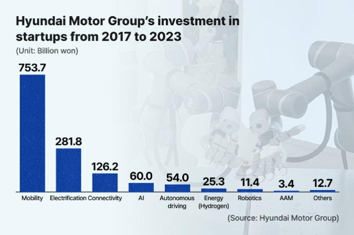 ومنذ عام 2017، استثمرت هيونداي موتور أكثر من 1.3 تريليون وون (حوالي 884 مليون دولار) في حوالي 200 شركة ناشئة لاكتشاف أفكار وتقنيات جديدة في مجالات مثل التنقل، الذكاء الاصطناعي، الاتصال، القيادة الذاتية، الكهرباء، الهيدروجين، والروبوتات.