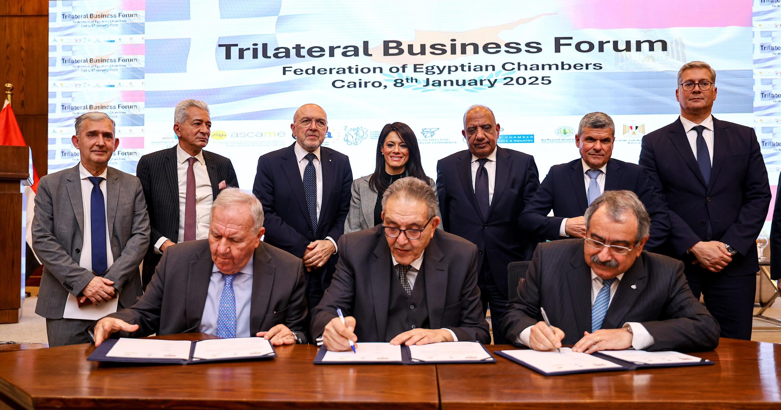 وقعت اتحادات الغرف المصرية واليونانية والقبرصية، بروتوكول تعاون لانشاء مجلس أعمال مشترك بين الدول الثلاث لتعزيز التعاون الثلاثي وزيادة حجم التبادل التجاري والاستثمارات المشتركة.